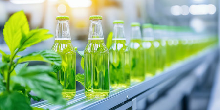 A vibrant scene showcasing bottles of a refreshing beverage moving along a production line in a modern factory, highlighting industrial efficiency.