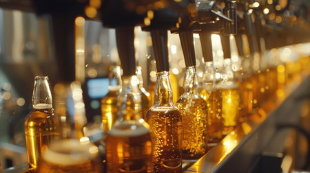 A close-up of bottles being filled with precision by automated nozzles, the golden hues of the beer contrasting with the stainless steel equipment, under the soft illumination of natural light.
