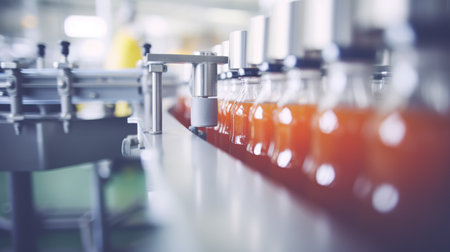 Conveyor Belt in Action: Fruit Juice Manufacturing. Generative AI