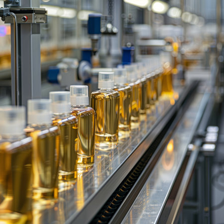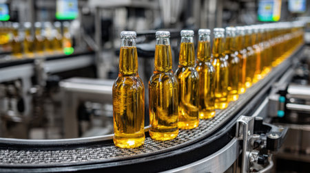 Bottles filled with golden liquid move smoothly along a conveyor belt in a modern beverage production facility, showcasing advanced manufacturing processes and equipment.
