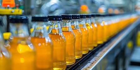 Bright orange beverage bottles line an assembly line in a modern factory setting, representing an efficient production process focused on quality and freshness.