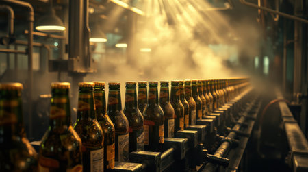 Bottles moving along a production line in a beverage factory. Steam and light create a dramatic atmosphere.