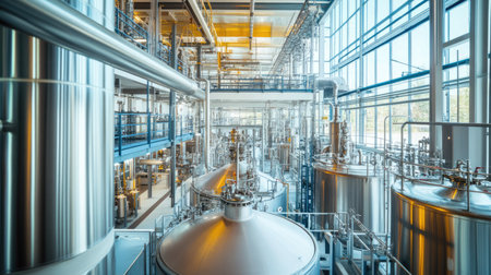 Medical or pharmaceutical laboratory. Chemical factory, interior of a high-tech plant with tanks and pipes.