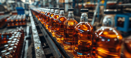 Close-up view of dark liquor bottles moving seamlessly along a conveyor belt, showcasing the intricate machinery and rich liquid inside as the production process unfolds.