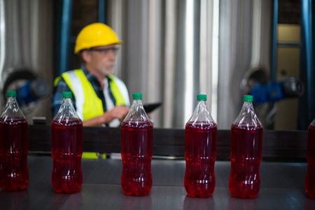 Bottles of juice on a production line with a worker inspecting them in a blurred industrial background.