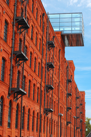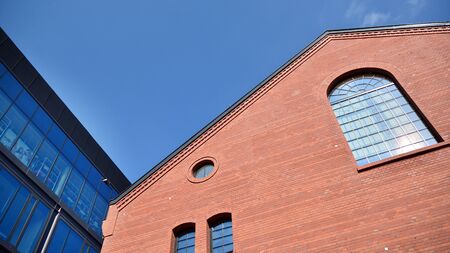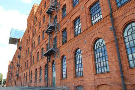 Facade of old brick building. Old factory building with windows in Polish city of Lodz. Old architecture in Poland. Facade of red brick factory building