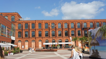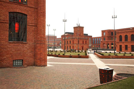 The arts centre, shopping mall, and leisure complex in Lodz, Poland. Red brick buildings, cloudy sky, pavement and dove on it.