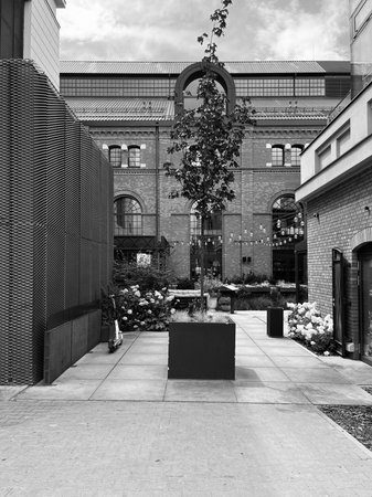 Black and white photo of a modern courtyard with a central potted tree, surrounded by brick and metal walls, leading to a historic industrial-style building with arched windows.