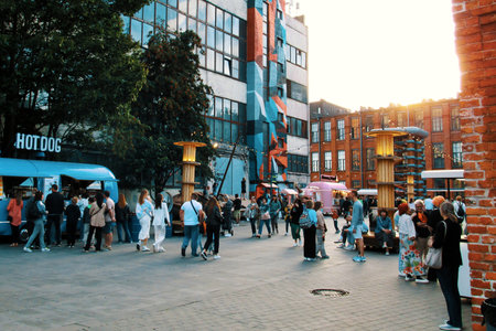 SAINT-PETERSBURG, RUSSIA - August 15, 2021. Tourists eat in Kuznya - renovated old building. New Holland - modern recreation park in historic center of town.