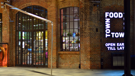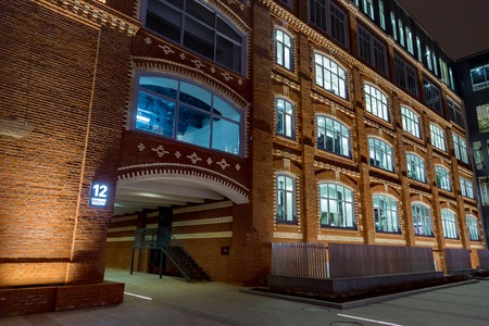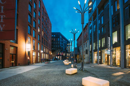 Shopping Mall in Lodz transformed from industrial buildings into elegant place for shopping in the evening, Poland