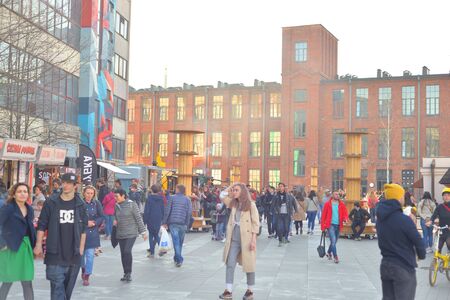 ST.PETERSBURG, RUSSIA - 21 APRIL 2019: The courtyard of a new public space Sevkabel Port in the harbor of Vasilievsky island.