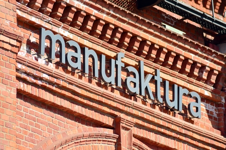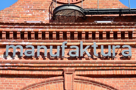 LODZ, POLAND - AUGUST 25, 2014: Installation of the inscription manufaktura against the background of the former weaving factory of I. Poznansky (modern shopping and cultural and entertainment center Manufacturing)