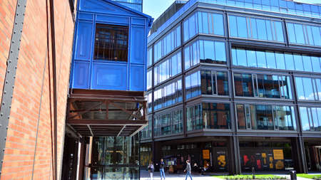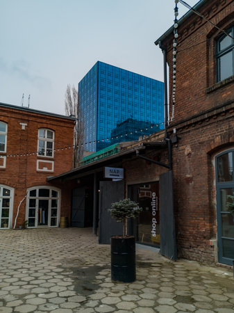 Lodz, Poland - February 23 2020 Contrasting buildings at Off square