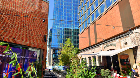 Warsaw, Poland. 18 June 2022. New business and financial district Wola with Fabryka Norblina office centrum. It is a new part of the city with offices, shops, restaurants and cafes