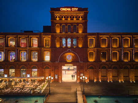 Front view of Manufaktura in Lodz, Poland, illuminated at night with Cinema City sign, HDR-style composition for travel, culture, architecture, and city promotion materials.
