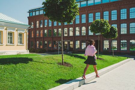 back view of unrecognizable young girl in a green skirt, pink jacket and sports sneakers who walks in the city holding a paper Cup of coffee in her hand