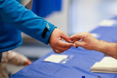 Shallow depth of field (selective focus) image with the hand of a man handing a stamp used in the first round of a presidential election, in Bucharest, Romania.