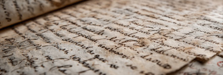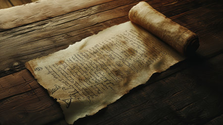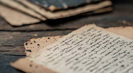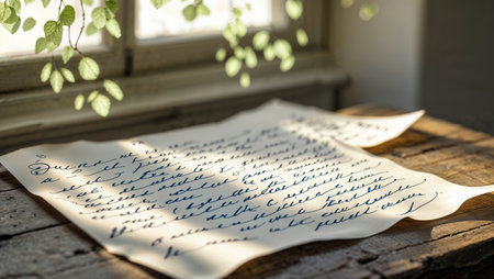 A delicate parchment with handwritten text lies on a rustic surface, gently lit by sunlight streaming through a window.