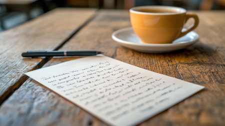A single sheet of paper with handwritten notes and a coffee cup in the background, set on a wooden office desk.