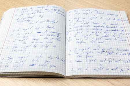Vietnam, Nha Trang, 14.07.2020: IELTS red pencils and essay notebook for the English exam