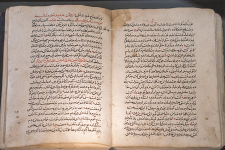 Stack of open ancient books in Arabic. Old Arabic manuscripts and texts. Top view
