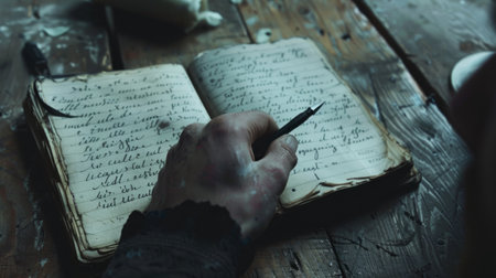 Trembling hands trying to write in a notebook, with illegible letters generative ai