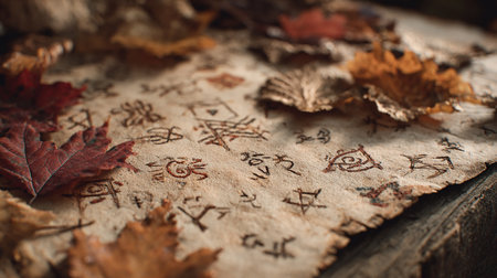 Old book with hieroglyphs and autumn leaves on wooden background