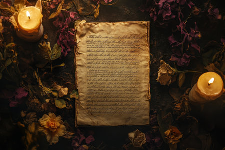 An aged manuscript rests on a table adorned with dried flowers and lit candles, creating a warm ambiance.