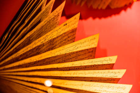 TURIN, ITALY - CIRCA MAY 2021: antique Medieval manuscript with ancient calligraphy.