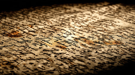 A delicate parchment with handwritten text lies on a rustic surface, gently lit by sunlight streaming through a window.