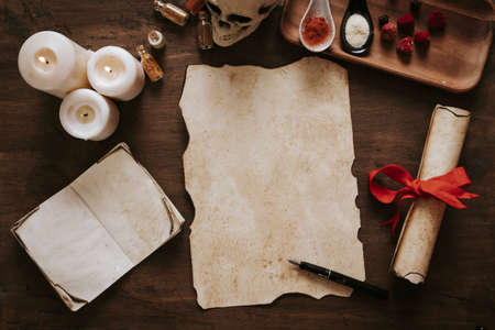 parchment ink pen near candles ingredients. High quality beautiful photo concept