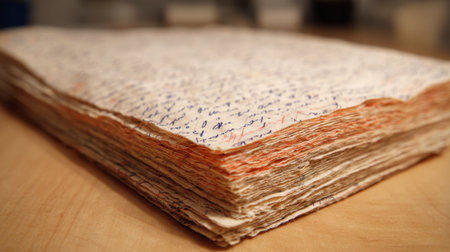 Handwritten pages filled with colorful ink create a vibrant texture on a rustic wooden table.