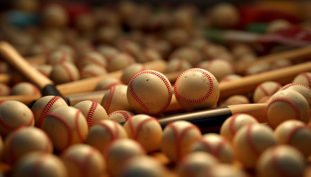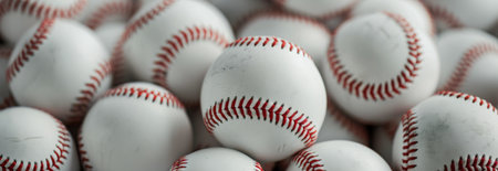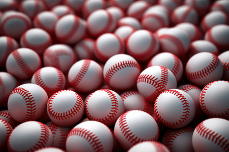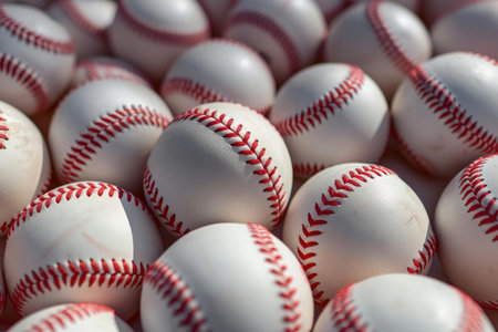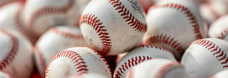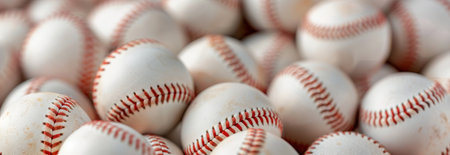 A close-up view of several baseballs, revealing their leather surface and red stitching. The image focuses on the textures and details of the baseballs, creating a sense of anticipation and readiness for the game.