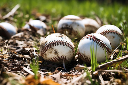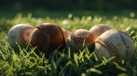 Group of used baseballs on green grass with warm sunset lighting, ideal for sport themes and backgrounds. A.I.