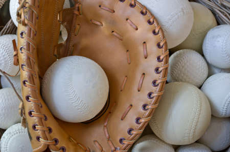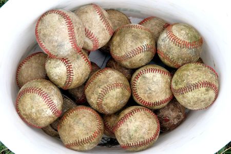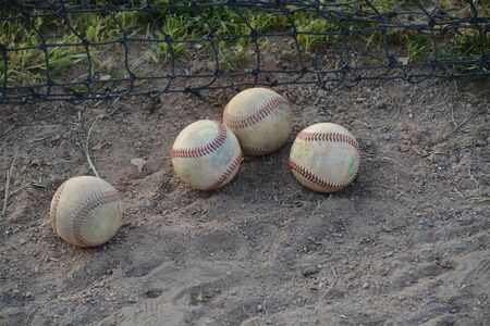 Pile and stack of old worn baseballs for sports and recreation pasttime