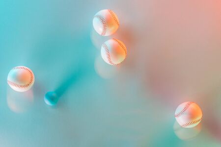 motion blue of white and leather softballs near ping pong ball on pink and blue