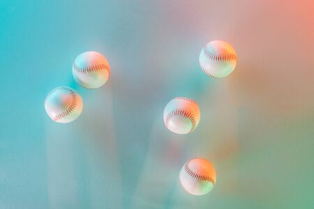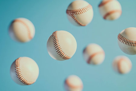 Floating baseballs against a light blue background, showcasing a dynamic sports concept with motion and energy, perfect for baseball enthusiasts and sports imagery