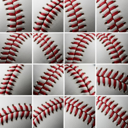 A detailed collage of close-up images showcasing the intricate red stitching patterns on a white baseball. Each image highlights a different angle and section of the stitching, emphasizing the texture and craftsmanship of the baseball.
