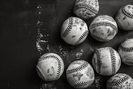 Black and white baseballs on dark background, top view. vintage sports equipment concept. black color theme. top down view of old worn out antique ball games for playing in club or league competition. old sports product banner with copy space. ,k resolution, high realistic details, wide angle shot,