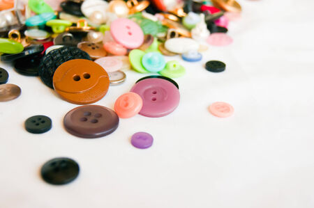 Multi-colored buttons background. Used buttons on a light textured surface. Side view. Selective focus. Eye level shooting.