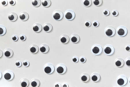Googly plastic eyes pattern on a light grey backgroud. Used for imitation of eyeballs for handcraft toys and dolls and others creativity. Flat lay.