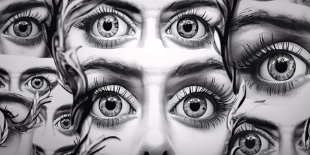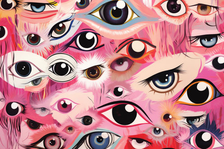 Psychedelic conceptual wide pattern with female eyes on a light background, abstract illustration of psychological content. AI generated.