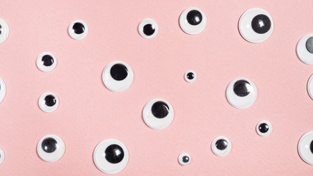 A bunch of toy eyes on an airtight two-color background split in half