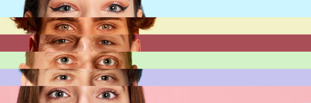 Vertical collage of open eyes of young multiethnic men and women on multicolored background. Concept of youth, unity, equality and diversity