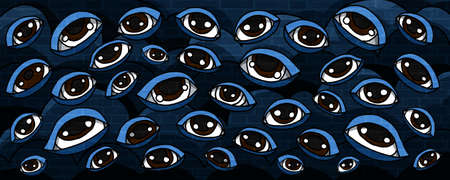 Surreal montage of floating eyes against a dark background.