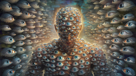 A man surrounded by many eyes with a face in the middle, AI