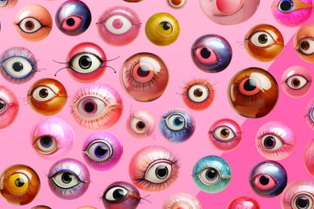 panoramic background from pink paper with many flat plastic doll eyes