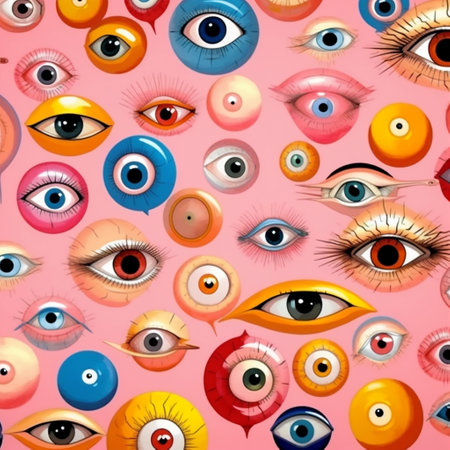 Lots of toy eye emojis on a multi-colored background split in half