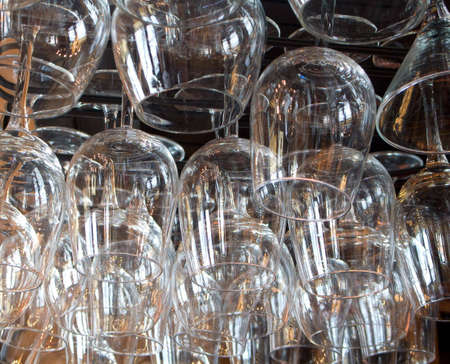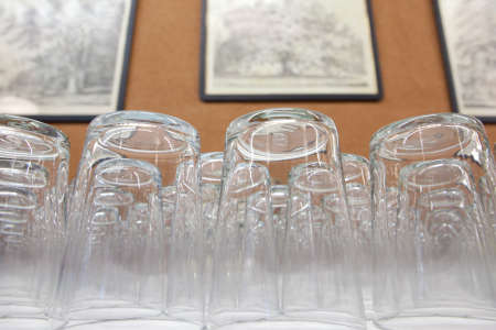 Close view on glass cups of a coffee shop turned upside down. Back of glass cups.