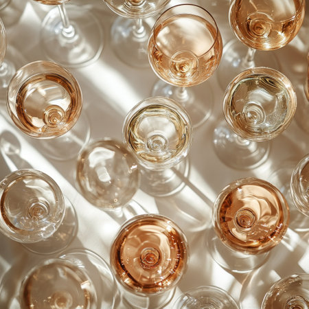 Several glasses of ros wine are arranged artistically on a soft surface, reflecting warm sunlight creating a pleasant ambiance during a relaxing afternoon gathering.